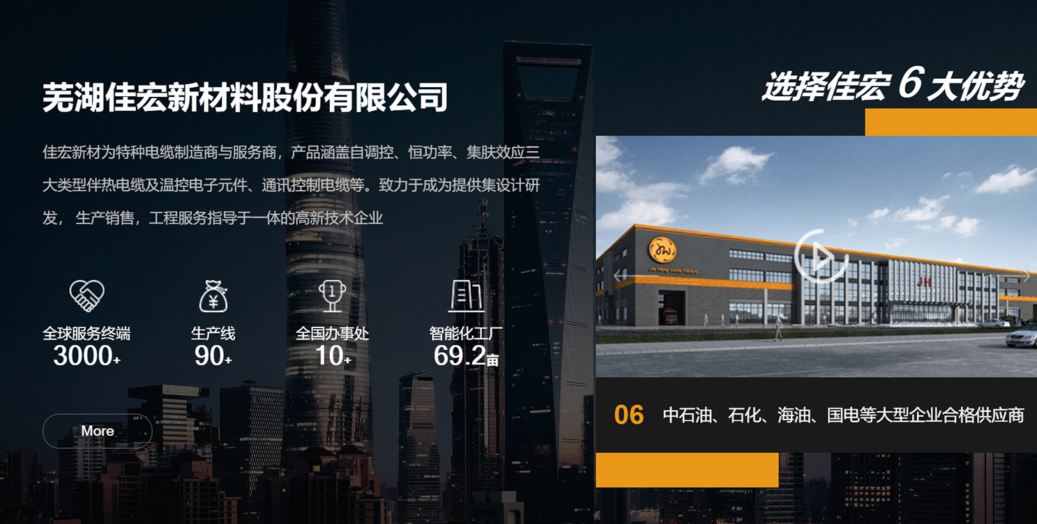 蕪湖佳宏新材料有限公司為國內伴熱行業規模的伴熱電纜制造商與服務商,注冊資金3787.75萬元,企業員工數348人,產品涵蓋自調控、恒功率、集膚效應三大類型伴熱電纜、通訊控制電纜等。是一家集設計研發, 生產銷售,工程服務指導于一體的高新技術企業。