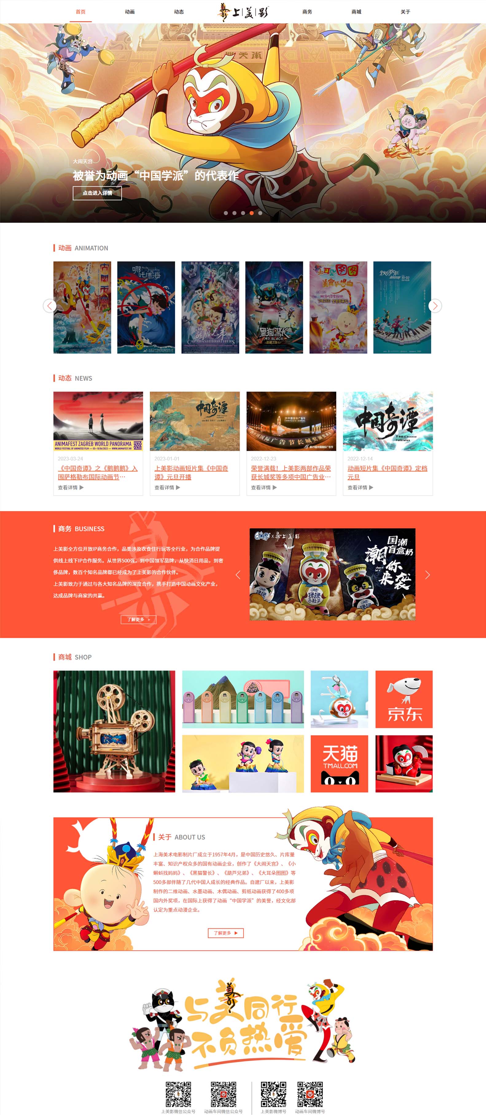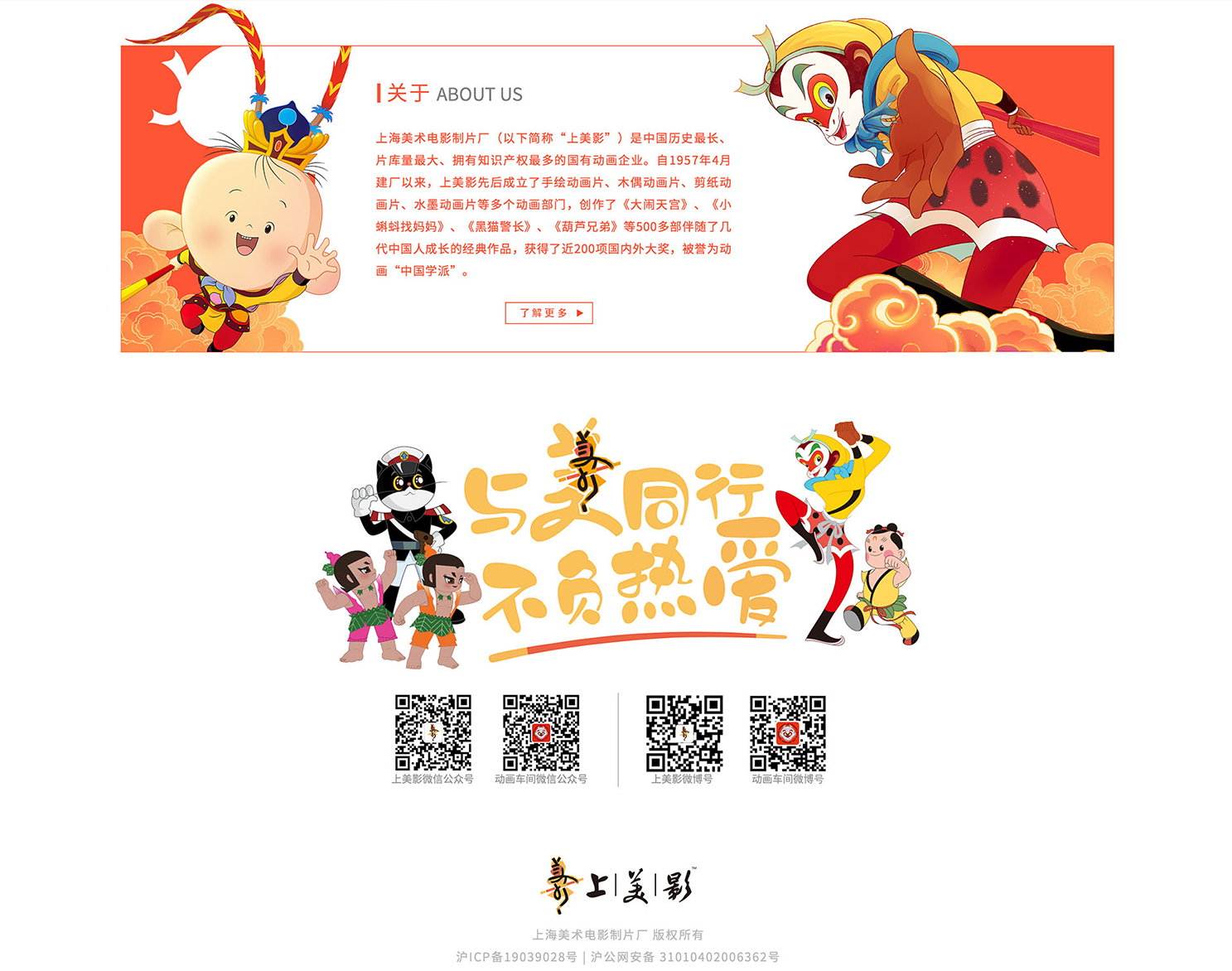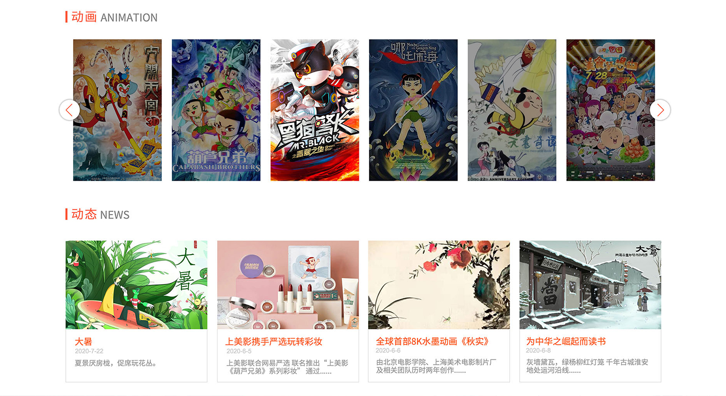 上海美術電影制片廠(以下簡稱“上美影廠 [1] ”)是歷史、片庫量、擁有知識產權較多的國有動畫企業。前身是東北電影制片廠卡通股,1949年成立美術片組,次年遷到上海。 自1957年4月建廠以來,上美影先后成立了手繪動畫片、木偶動畫片、剪紙動畫片、水墨動畫片等多個動畫部門,創作了《大鬧天宮》、《小蝌蚪找媽媽》、《黑貓警長》、《葫蘆兄弟》等500多部伴隨了幾代中國人成長的經典作品,獲得了近200項國內外大獎,以動畫“學派”享譽國際。2020年9月,是涵智團隊在設計項目中,一個提升的重要日子,憑借專業的服務能力,與上海美術電影制片廠攜手建設官網,讓我們小時候的經典印象再次重現。