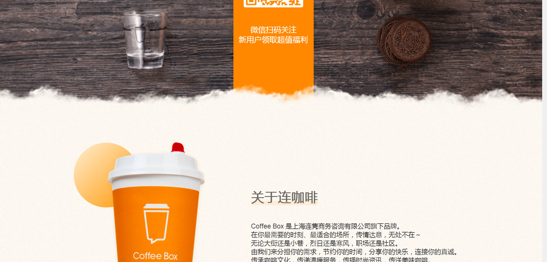 關于連咖啡Coffee Box 是上海連雋商務咨詢有限公司旗下。在你需要的時刻、適合的場所,傳情達意,無處不在~無論大街還是小巷,烈日還是寒風,職場還是社區。由我們來分擔你的需求,節約你的時間,分享你的快樂,連接你的真誠。傳承咖啡文化,傳遞溫暖服務,傳播時尚資訊,傳送美味咖啡。