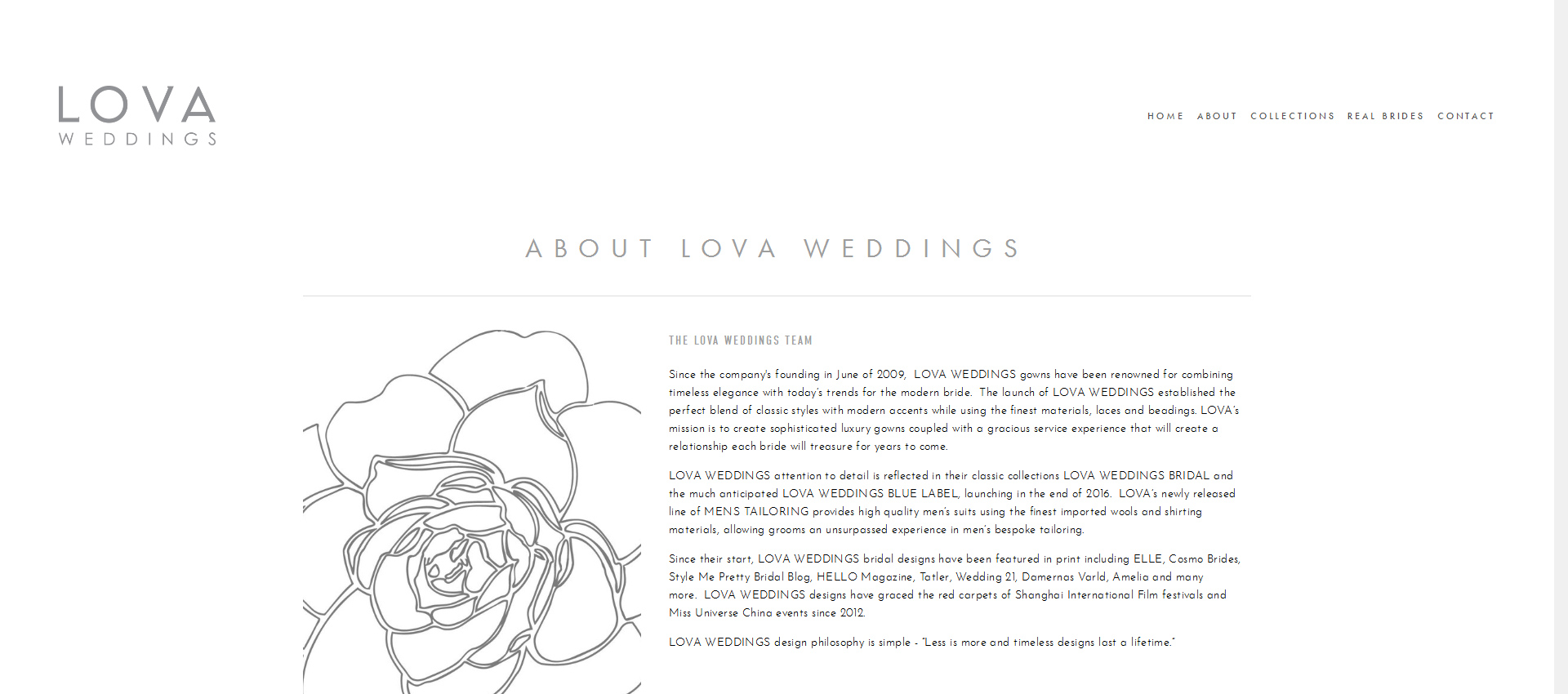 Since the company's founding in June of 2009, LOVA WEDDINGS gowns have been renowned for combining timeless elegance with today’s trends for the modern bride. The launch of LOVA WEDDINGS established the perfect blend of classic styles with modern accents while using the finest materials, laces and beadings. LOVA’s mission is to create sophisticated luxury gowns coupled with a gracious service experience that will create a relationship each bride will treasure for years to come.