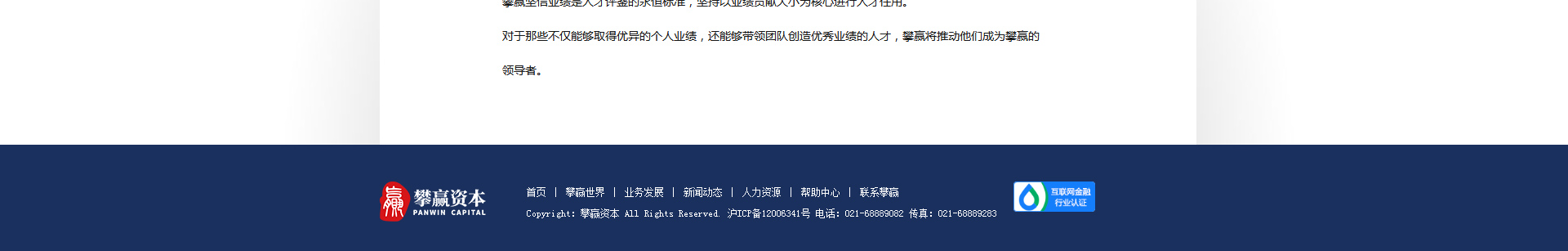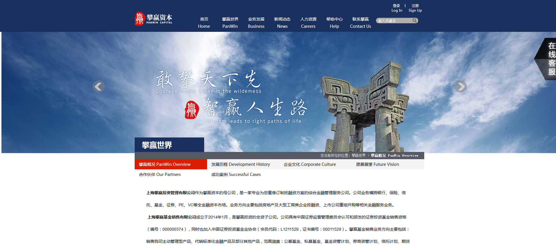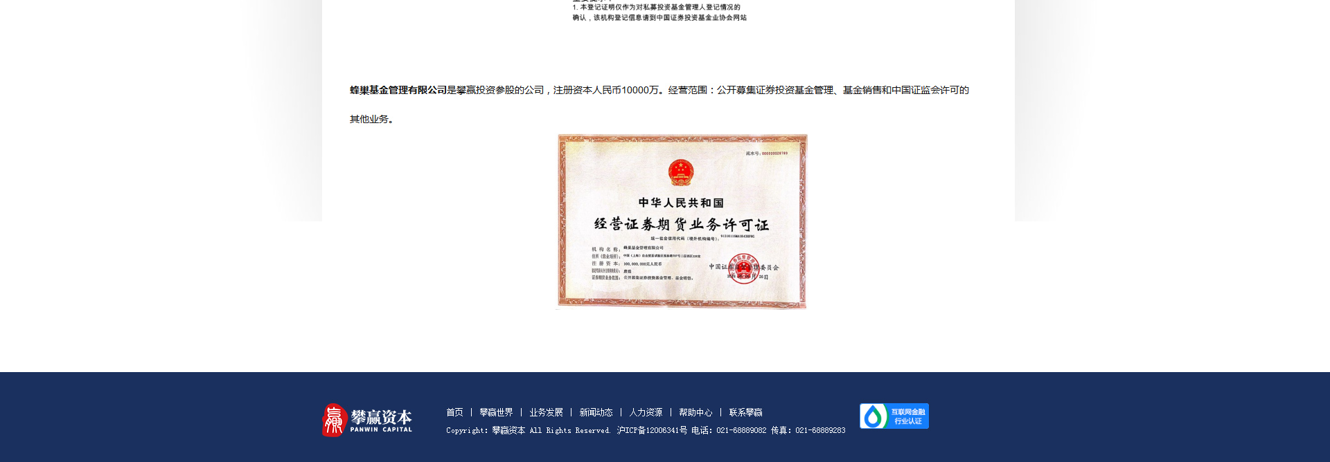 上海攀贏投資管理有限公司作為攀贏資本的母公司,是一家為您量身訂制投融資方案的綜合金融管理服務公司。公司業務橫跨銀行、保險、信托、基金、證券、PE、VC等全金融資本市場。業務方向主要包括房地產及大型工商類企業投融資、上市公司重組并購等相關金融服務業務。上海攀贏基金銷售有限公司成立于2014年1月,是攀贏投資的全資子公司。公司具有證券監督管理委員會認可和頒發的證券投資基金銷售資格。